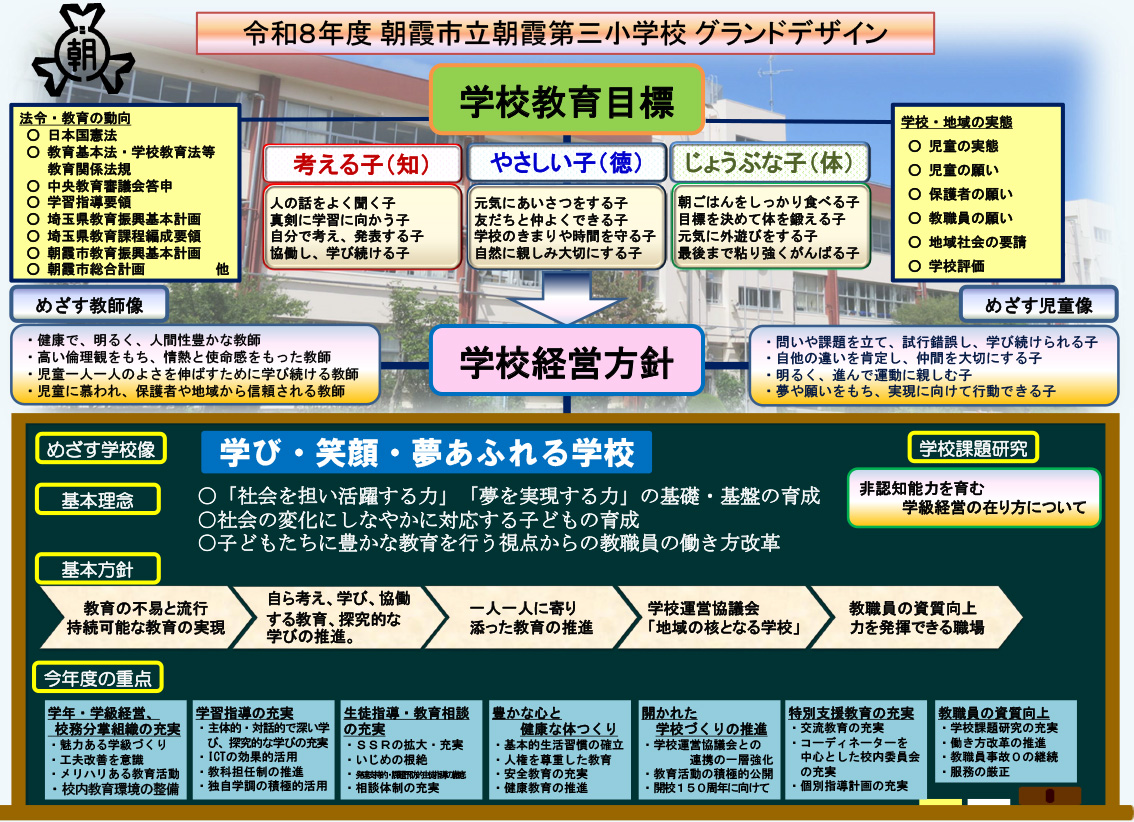 本校は「学び・笑顔・夢あふれる学校」を目指す学校像とし、子どもたちが「社会を担い活躍する力」「夢を実現する力」の基礎基本を育成すべく日々の教育活動に取り組んでいます。